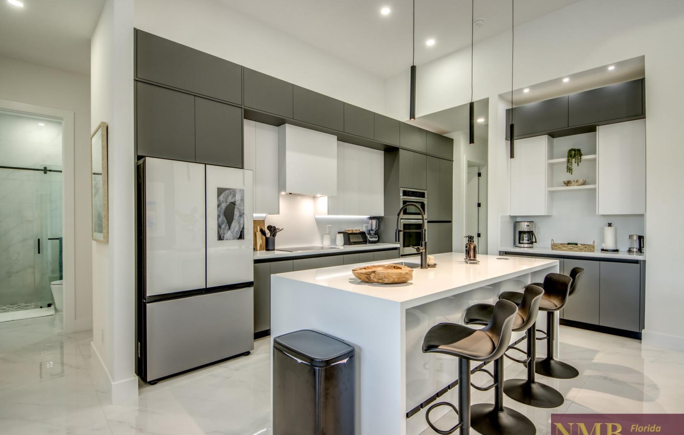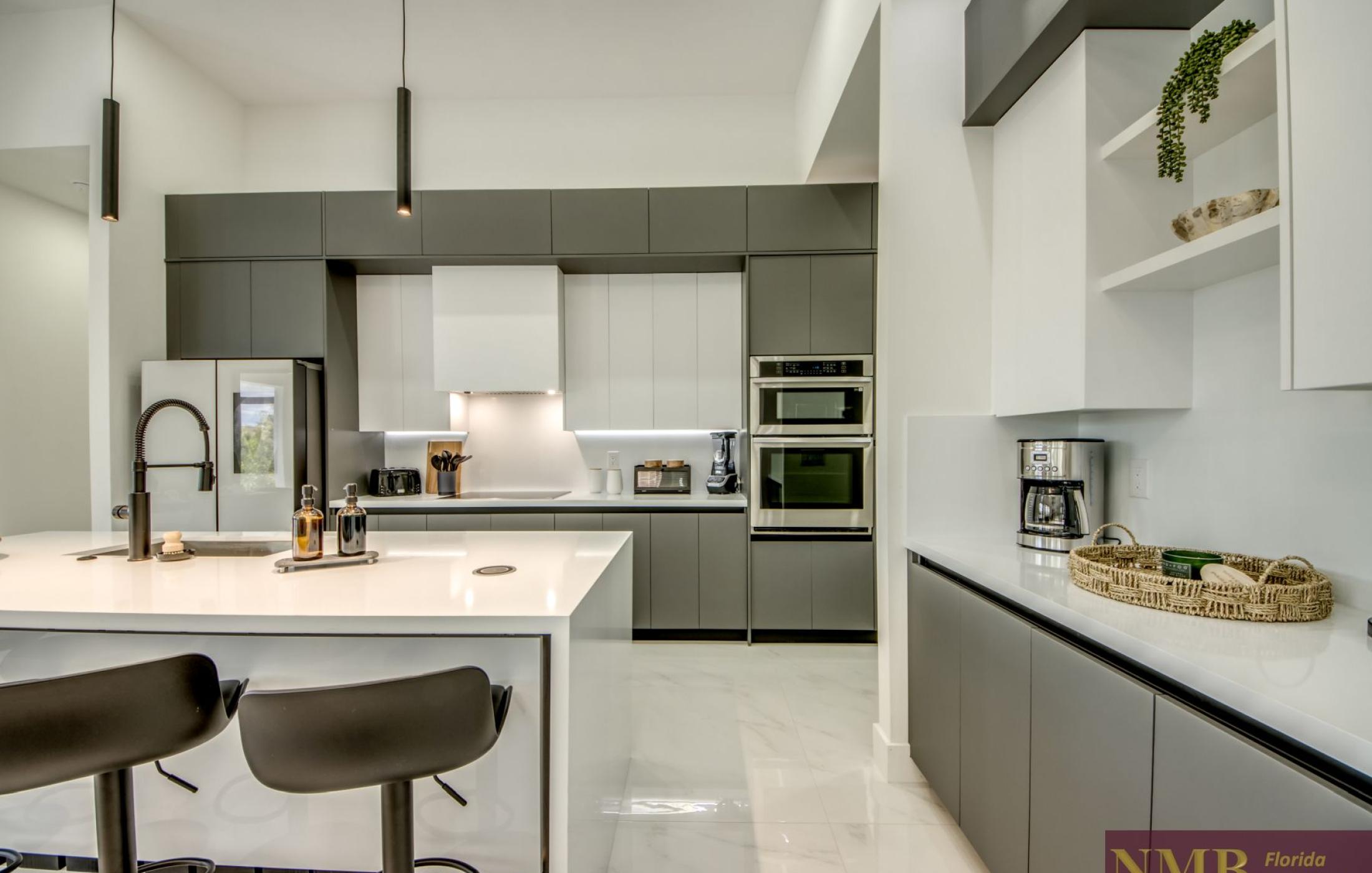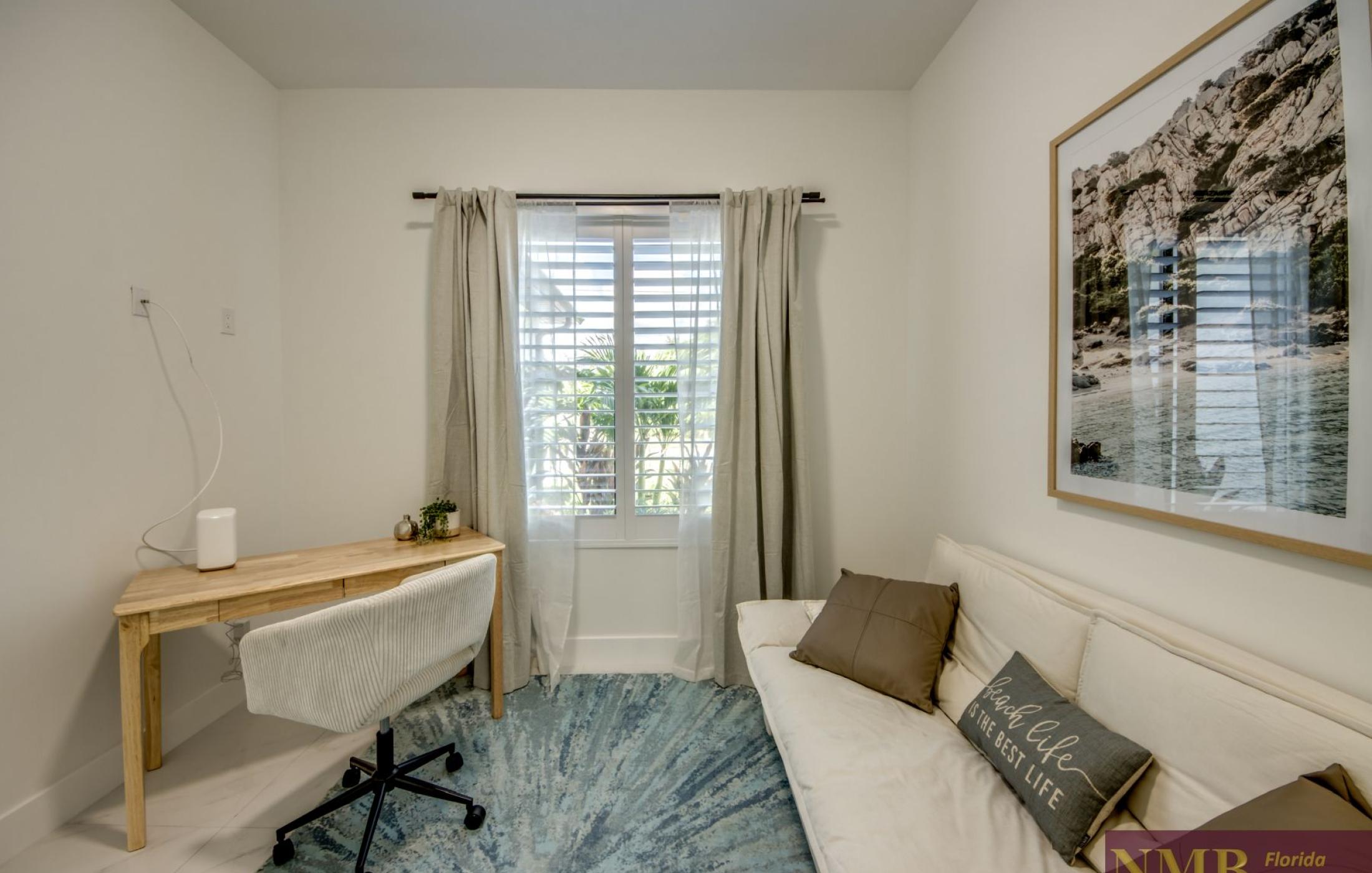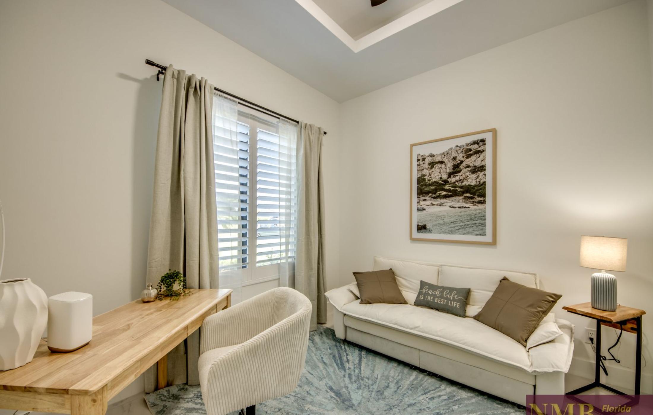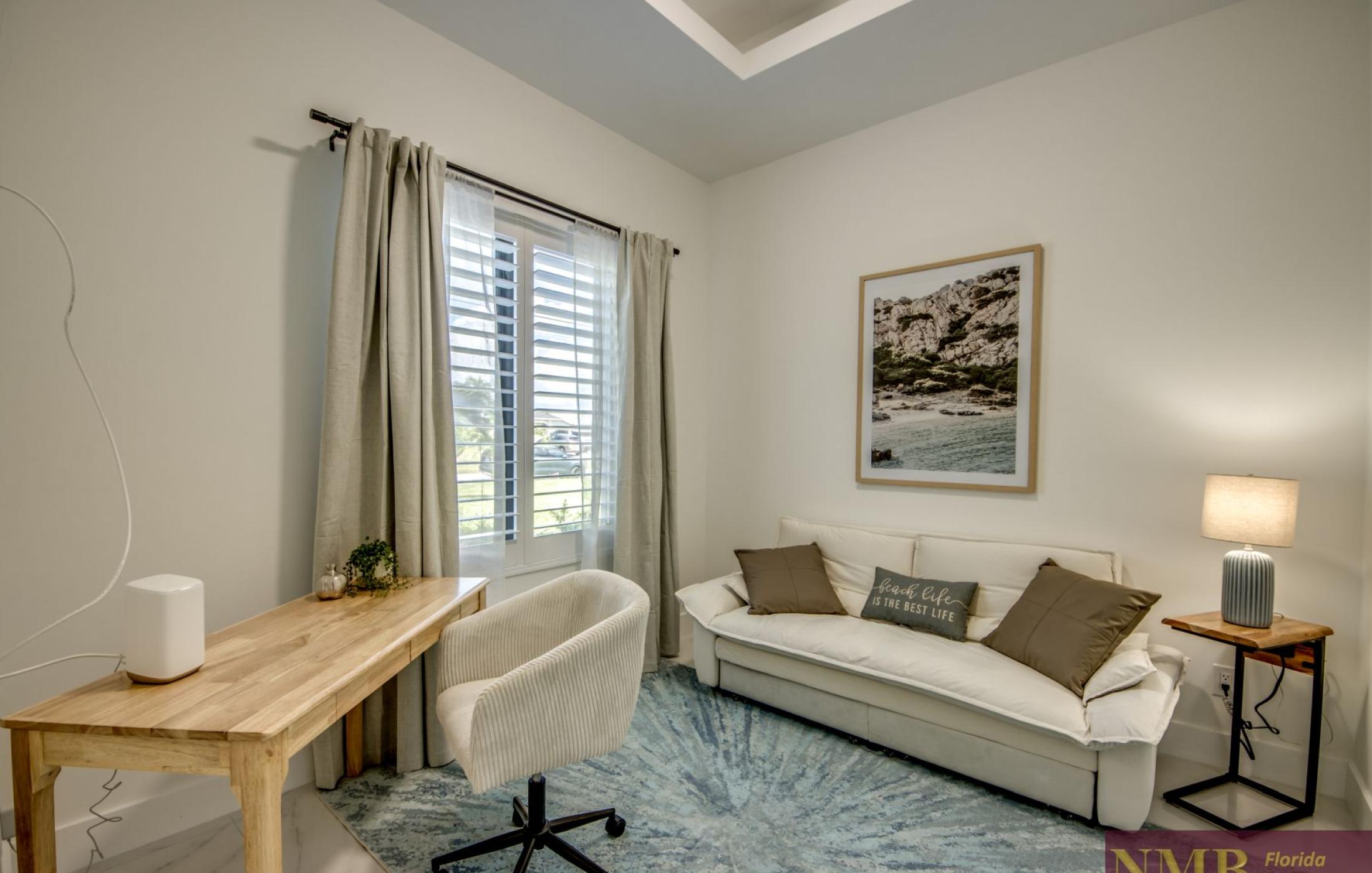 A separate office has been set up for productive hours or working from home. The garage offers enough space for two vehicles and provides additional storage space. The high ceilings create a pleasant, open feeling, which is further emphasized by the open floor plan.
